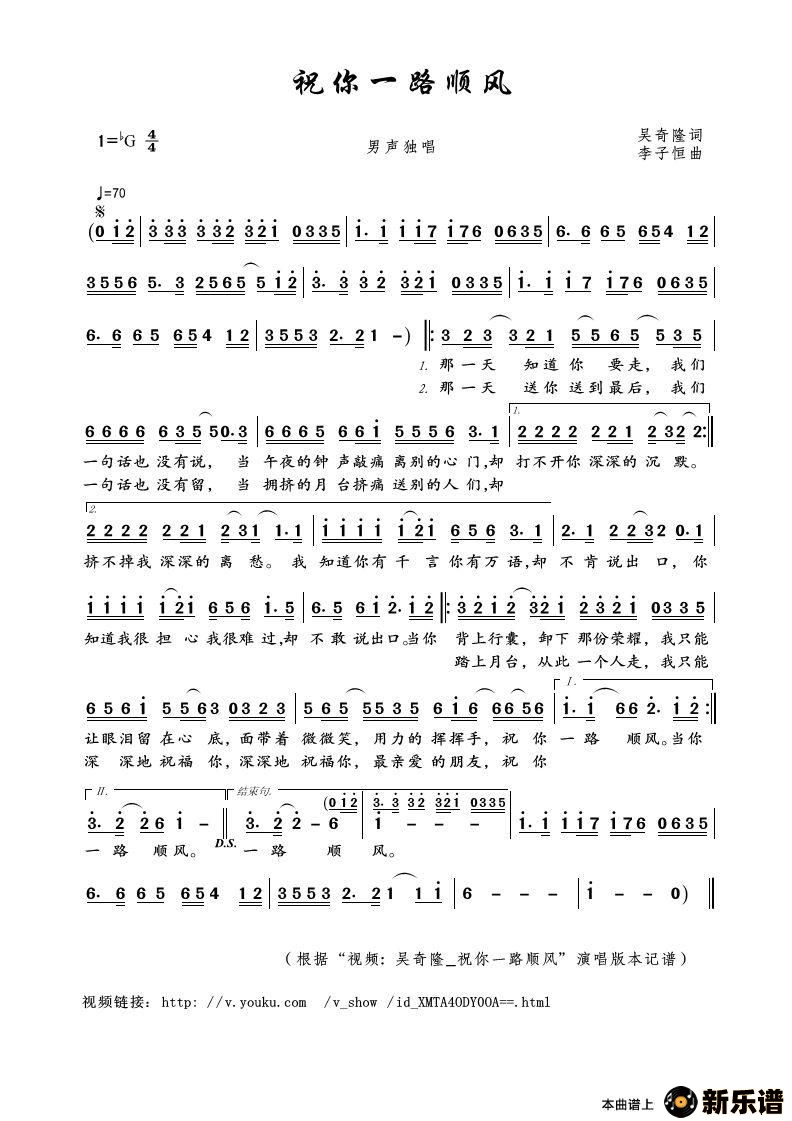《祝你一路顺风》最新曲谱 吴奇隆-君羊制谱