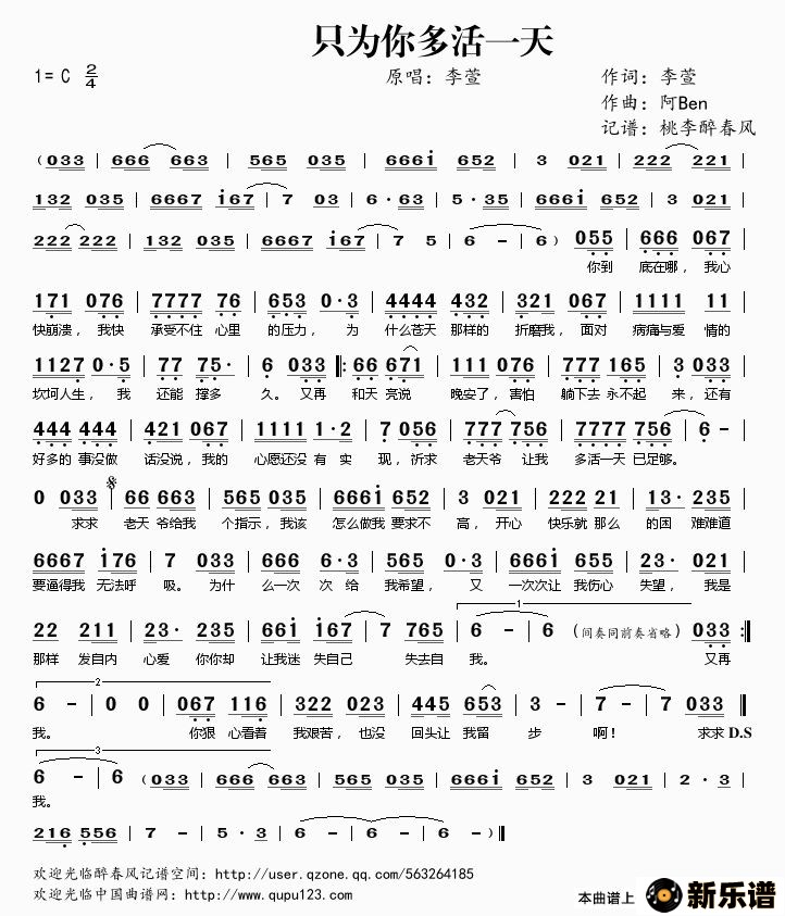 李萱演唱的只为你多活一天歌词,只为你多活一天最新曲谱.