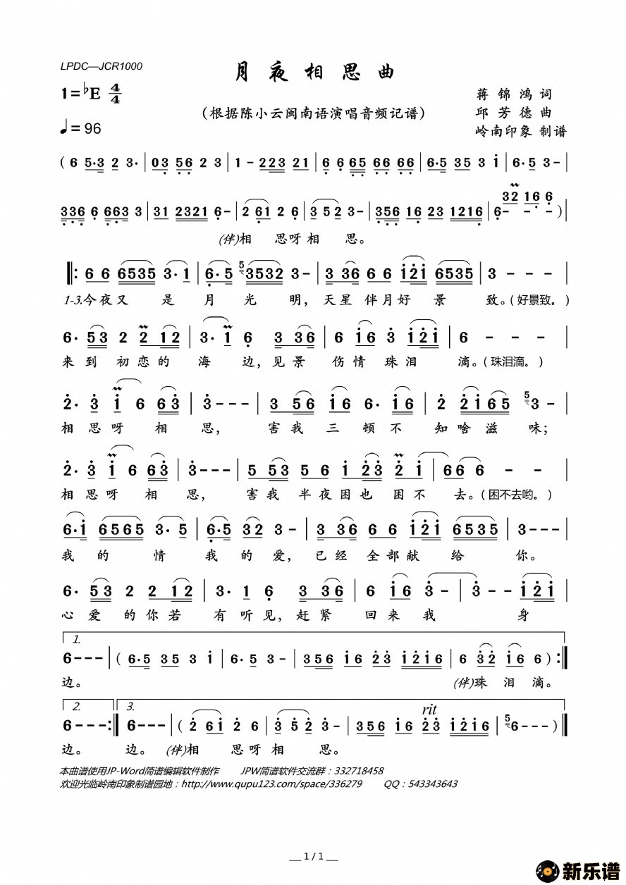 《月夜相思曲》最新曲谱 陈小云-岭南印象制谱