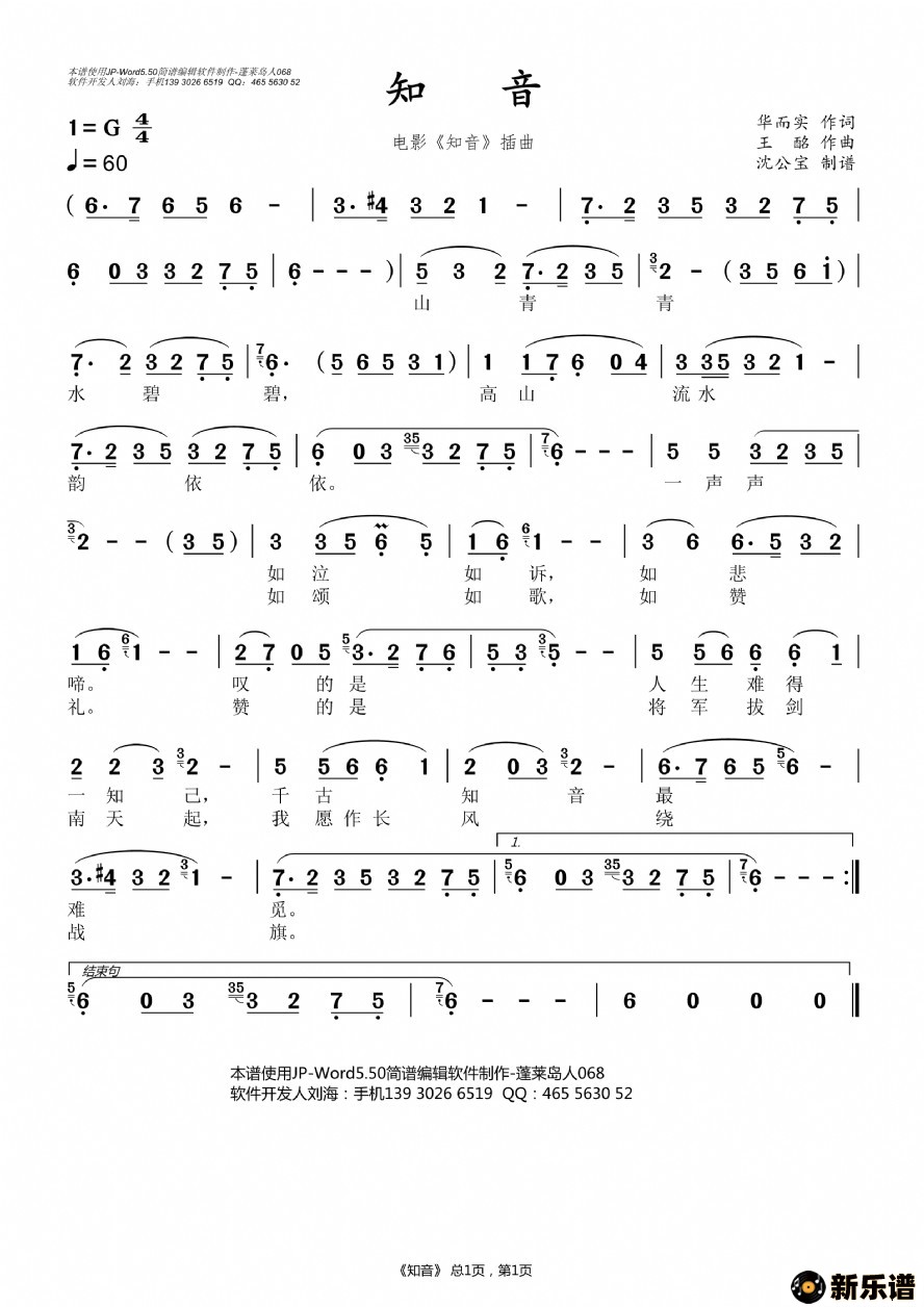 《知音》最新曲谱 -沈公宝制谱
