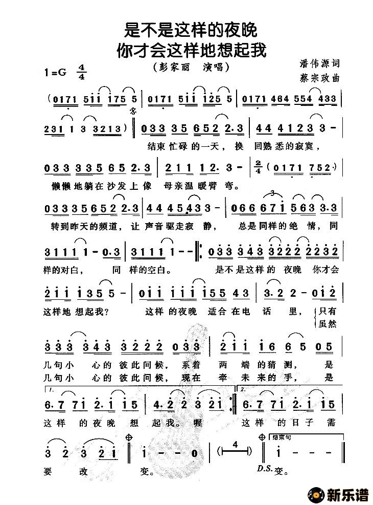 《是不是这样的夜晚你才会这样地想起我》最新曲谱 彭家丽
