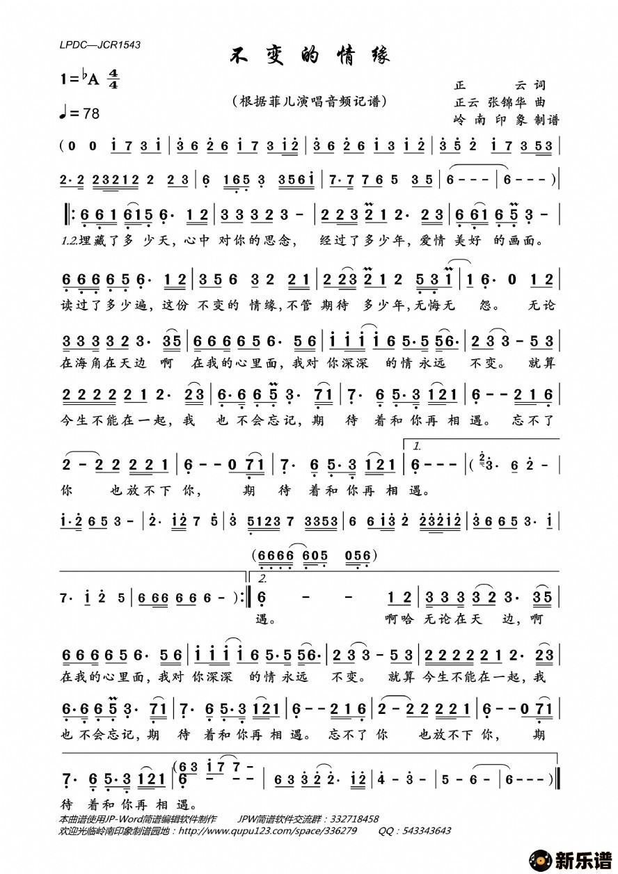 《不变的情缘》最新曲谱 菲儿-岭南印象制谱