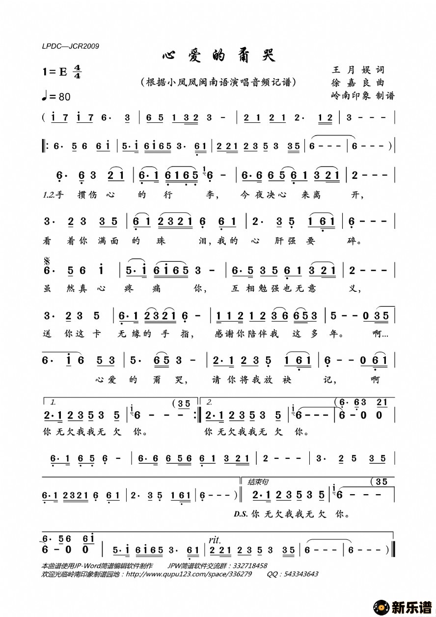 《心爱的甭哭》最新曲谱 小凤凤-岭南印象制谱