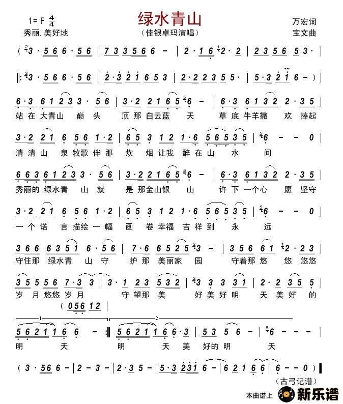 《绿水青山》最新曲谱 佳银卓玛-古弓制谱