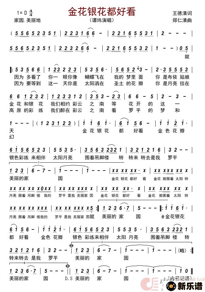 谭玮演唱的金花银花都好看 歌词,金花银花都好看 最新曲谱.