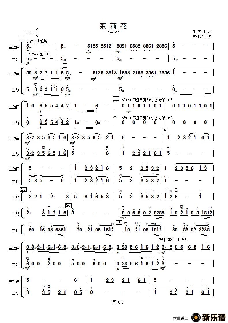 演唱的茉莉花歌词,茉莉花最新曲谱.