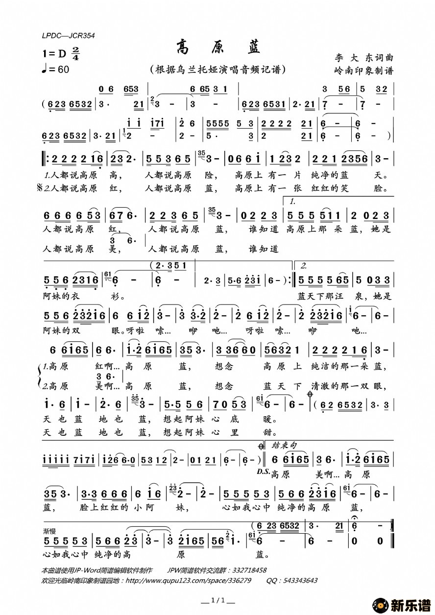 《高原蓝》最新曲谱 乌兰托娅-岭南印象制谱