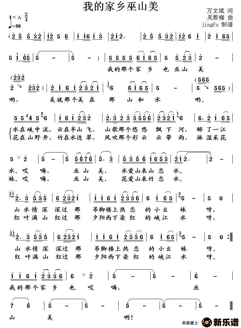 演唱的我的家乡巫山美歌词,我的家乡巫山美最新曲谱.