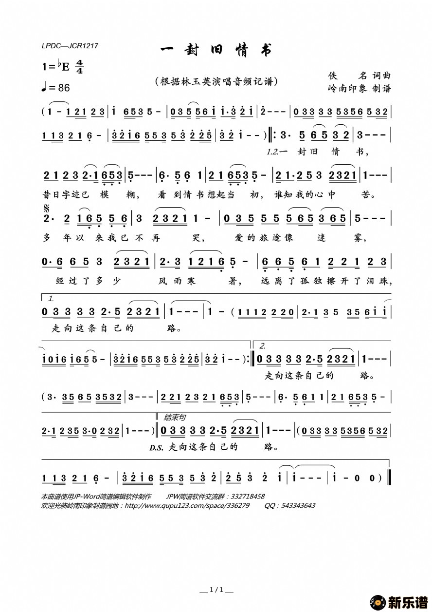 《一封旧情书》最新曲谱 林玉英-岭南印象制谱