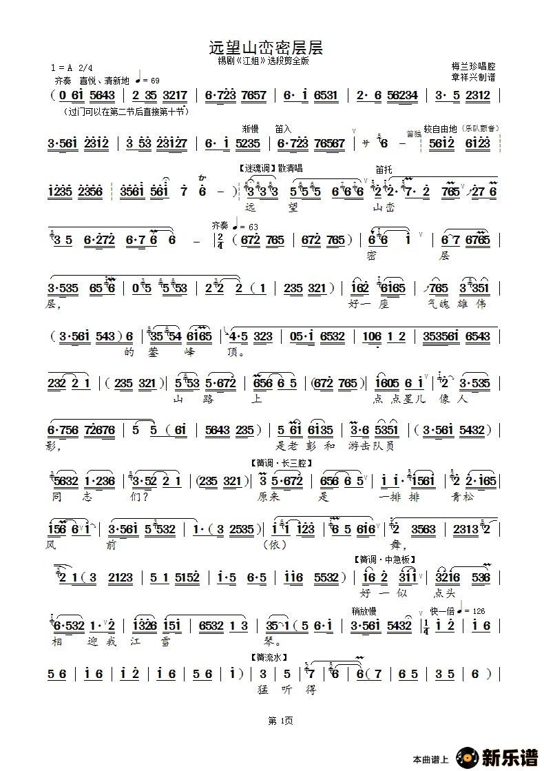梅兰珍演唱的远望山峦密层层歌词,远望山峦密层层最新曲谱.