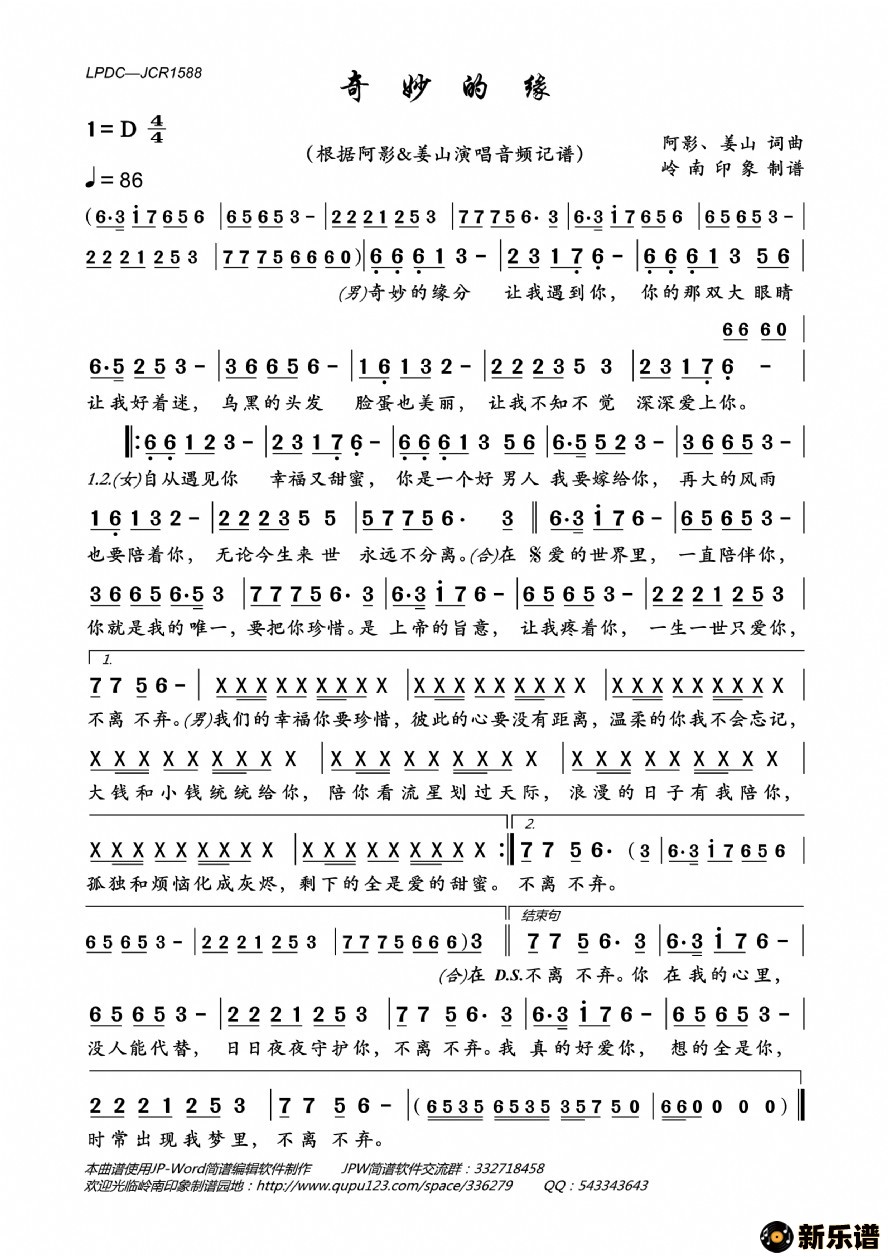 《奇妙的缘》最新曲谱 阿影&姜山-岭南印象制谱
