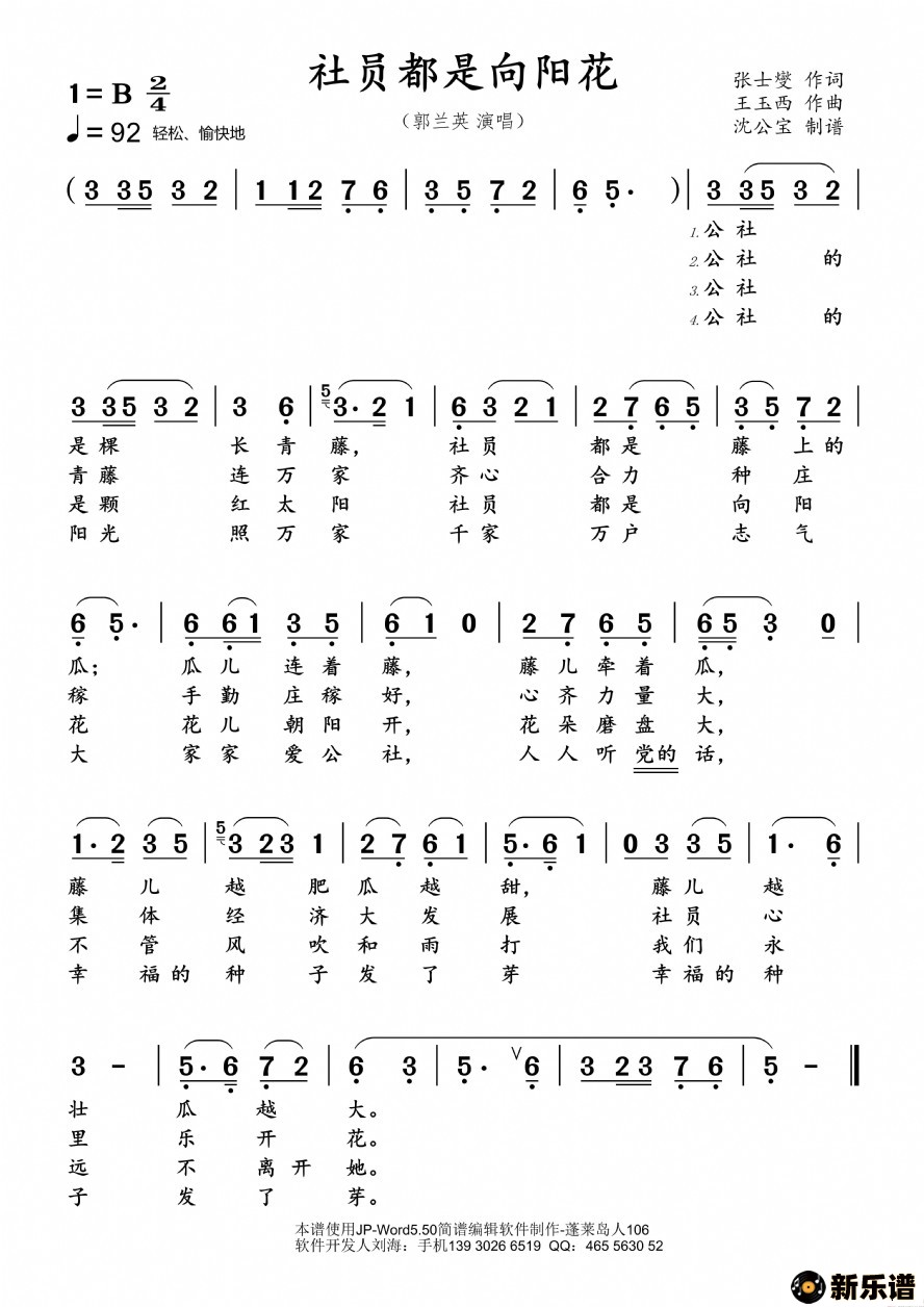 《社员都是向阳花》最新曲谱 郭兰英-沈公宝制谱