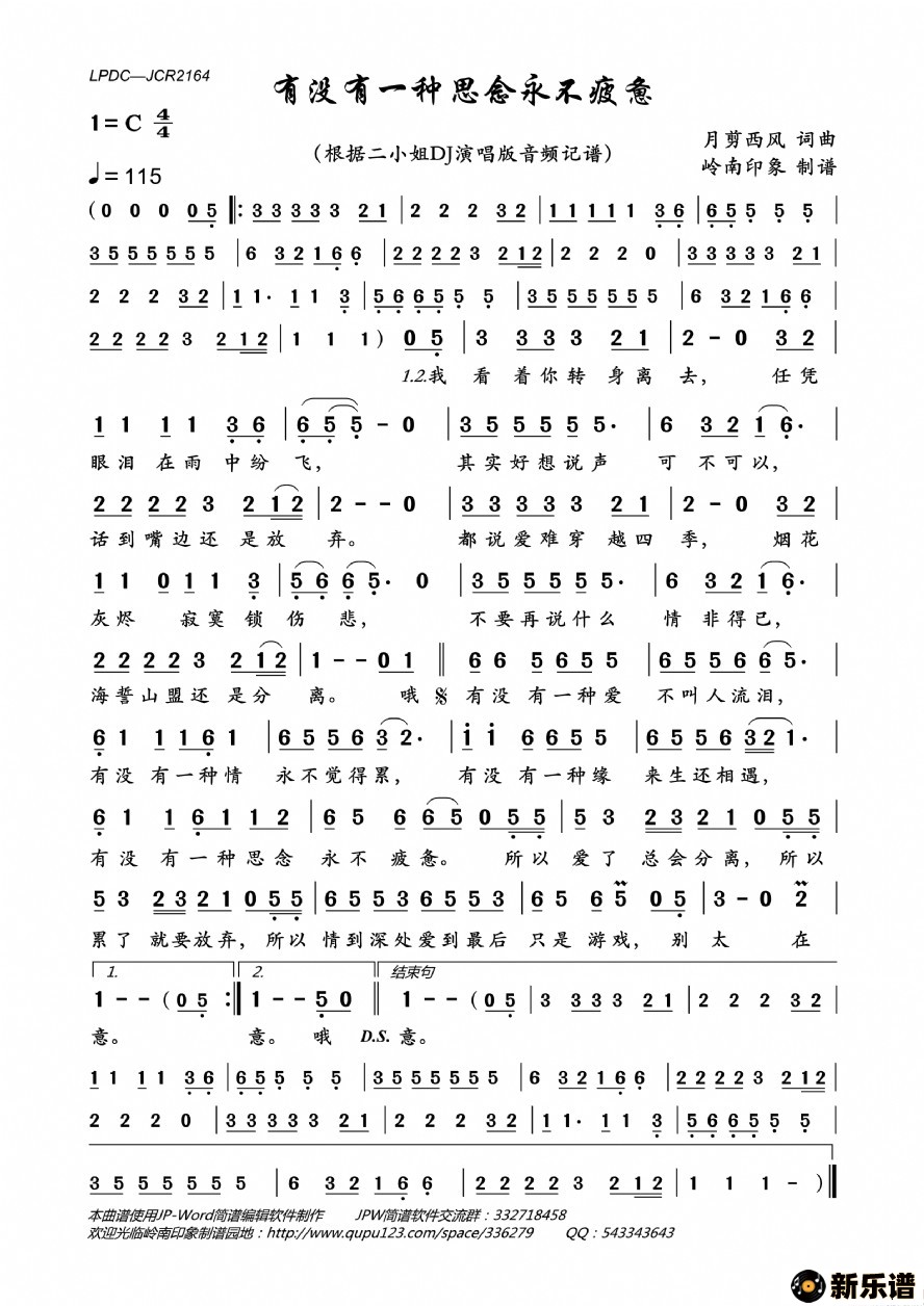 《有没有一种思念永不疲惫》最新曲谱 二小姐-岭南印象制谱