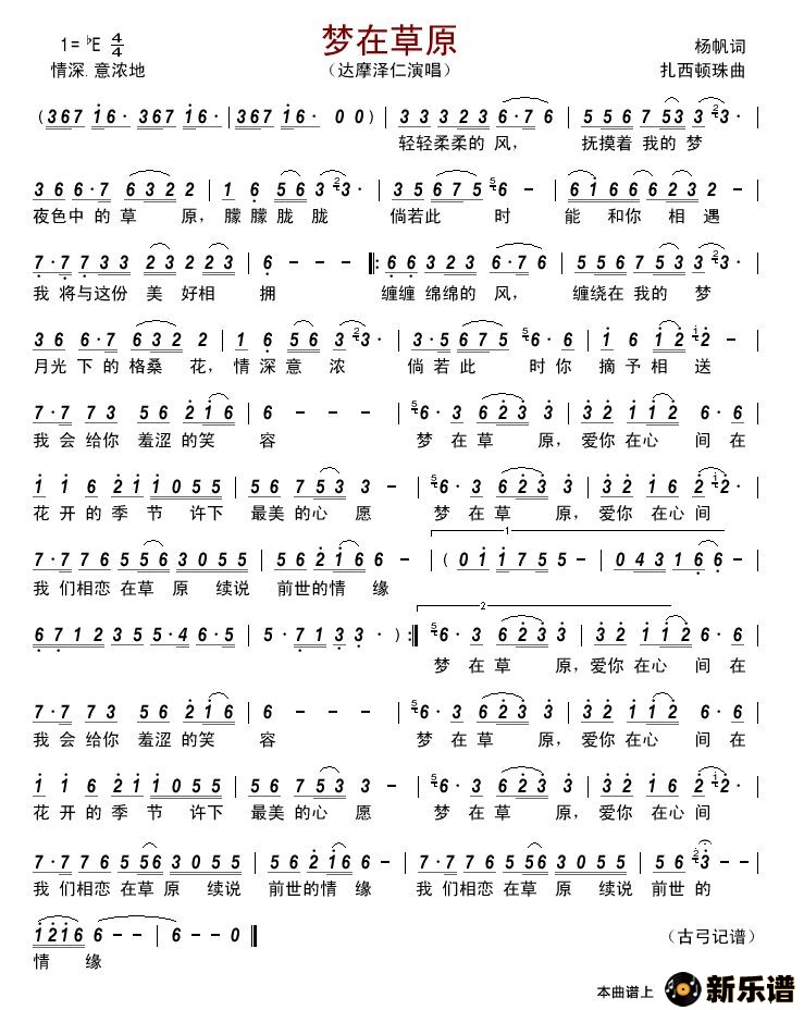达摩泽仁演唱的梦在草原歌词,梦在草原最新曲谱.