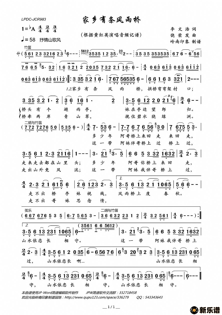 《家乡有条风雨桥》最新曲谱 黄红英-岭南印象制谱