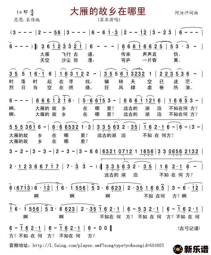 《大雁的故乡在哪里》最新曲谱 苏亚-古弓制谱