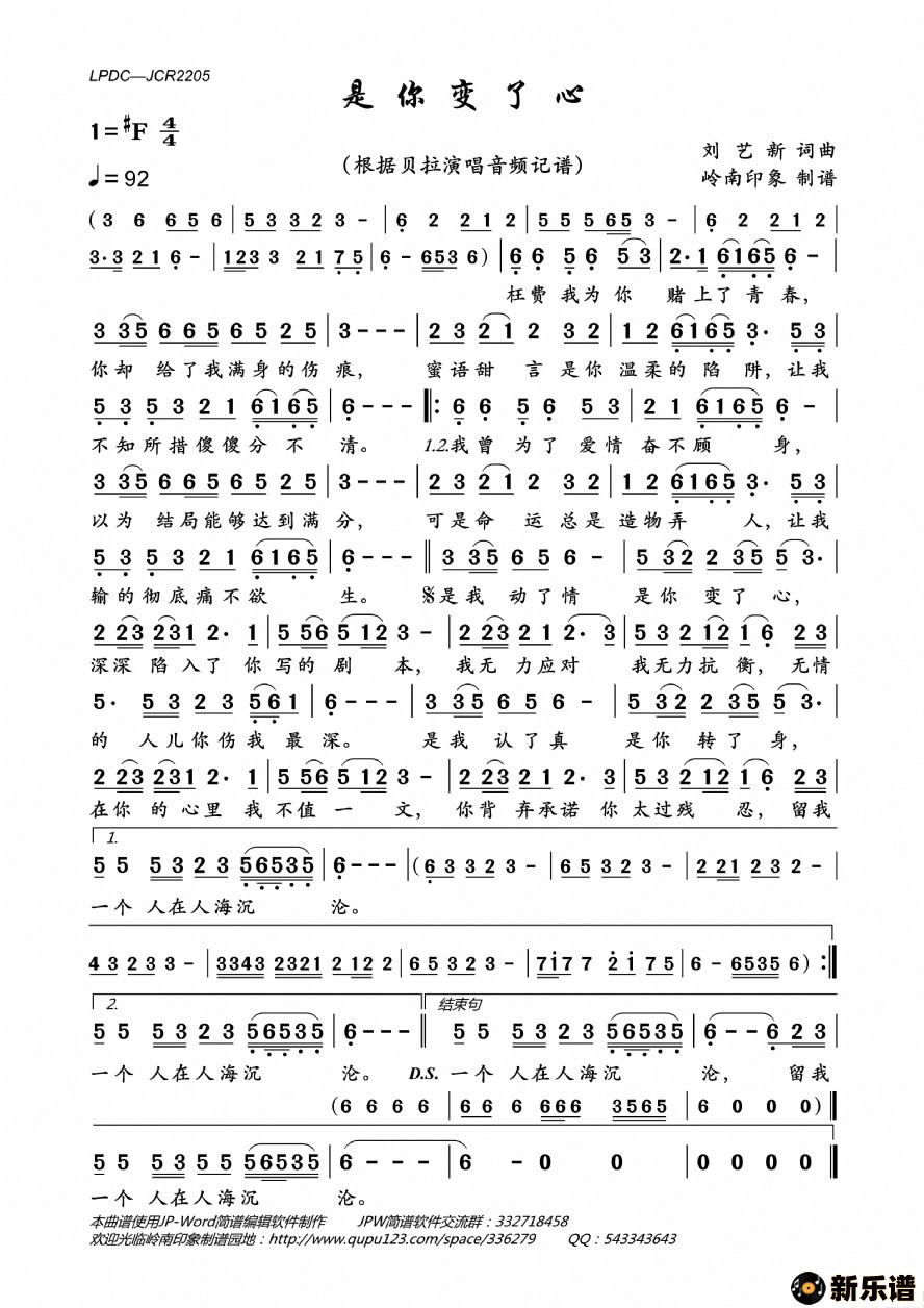 《是你变了心》最新曲谱 贝拉-岭南印象制谱