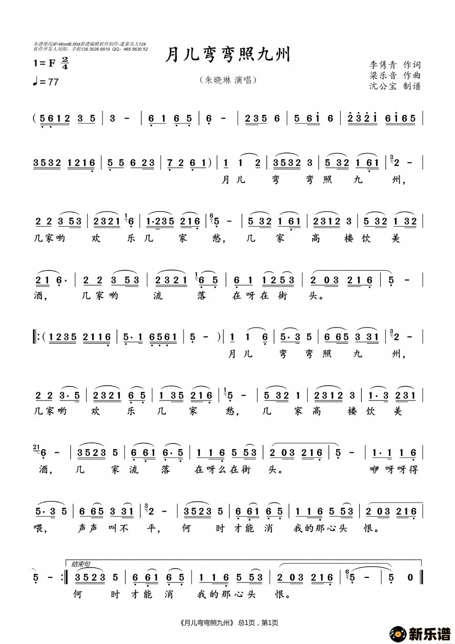 《月儿弯弯照九州》最新曲谱 朱晓琳-沈公宝制谱