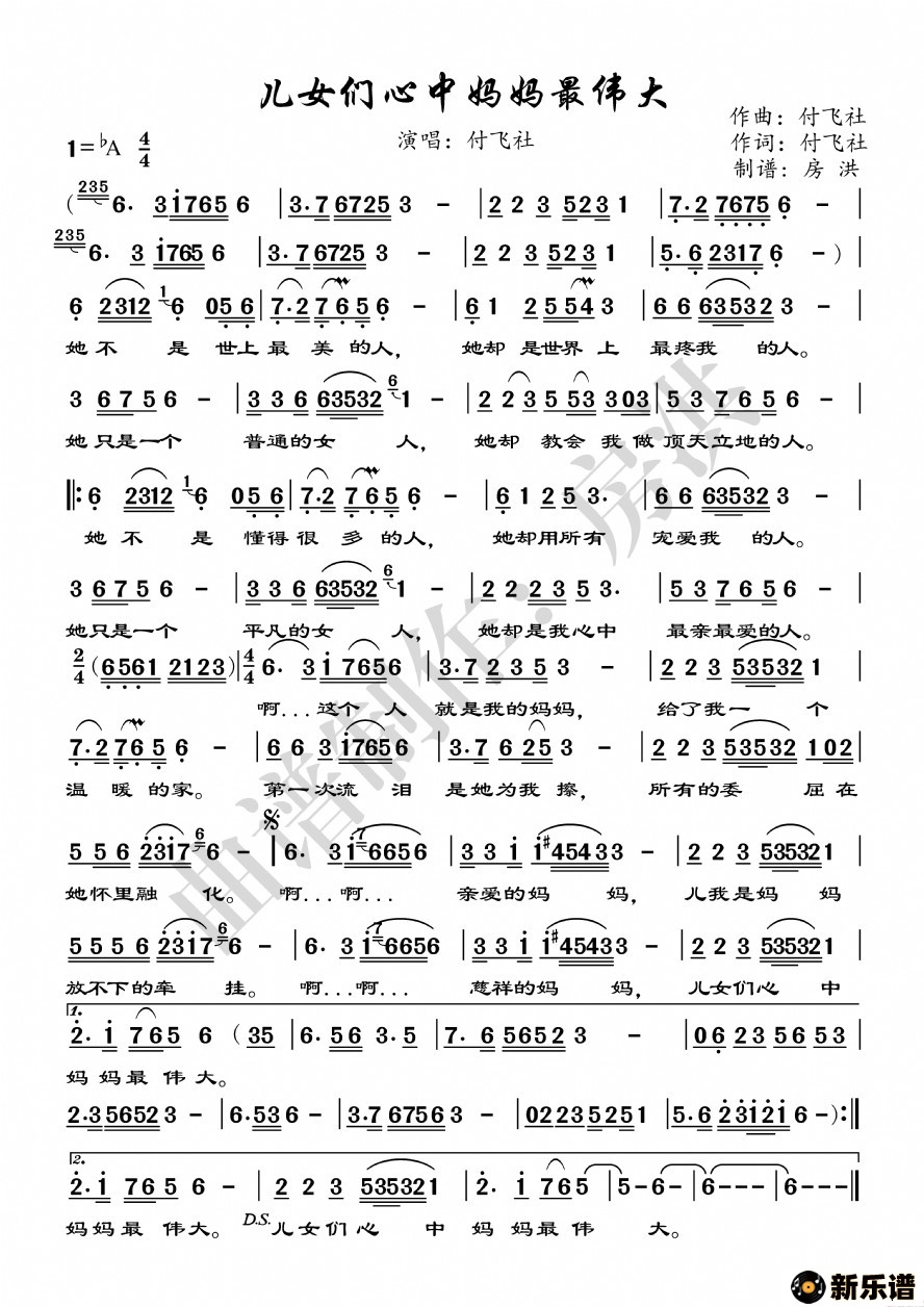 《儿女们心中妈妈最伟大》最新曲谱 付飞社