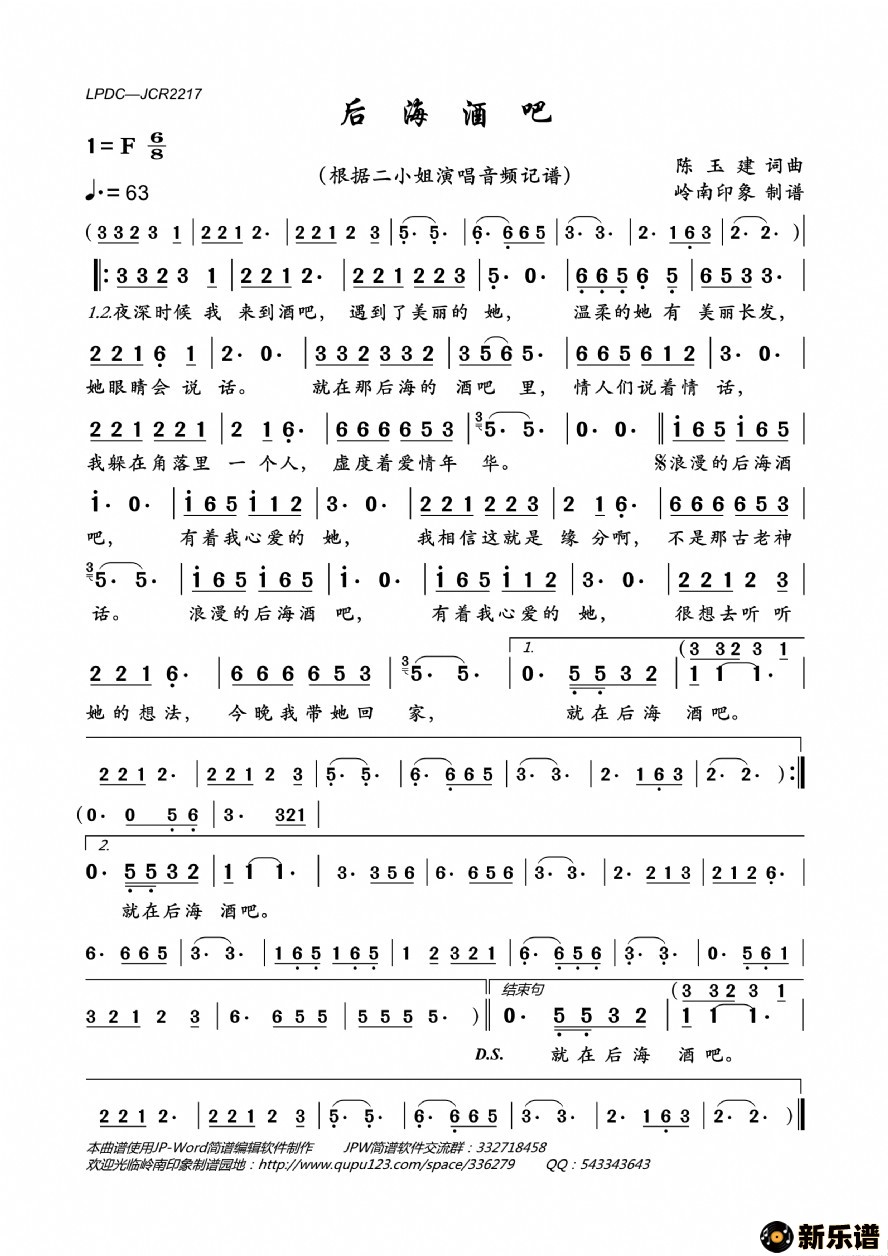 《后海酒吧》最新曲谱 二小姐-岭南印象制谱