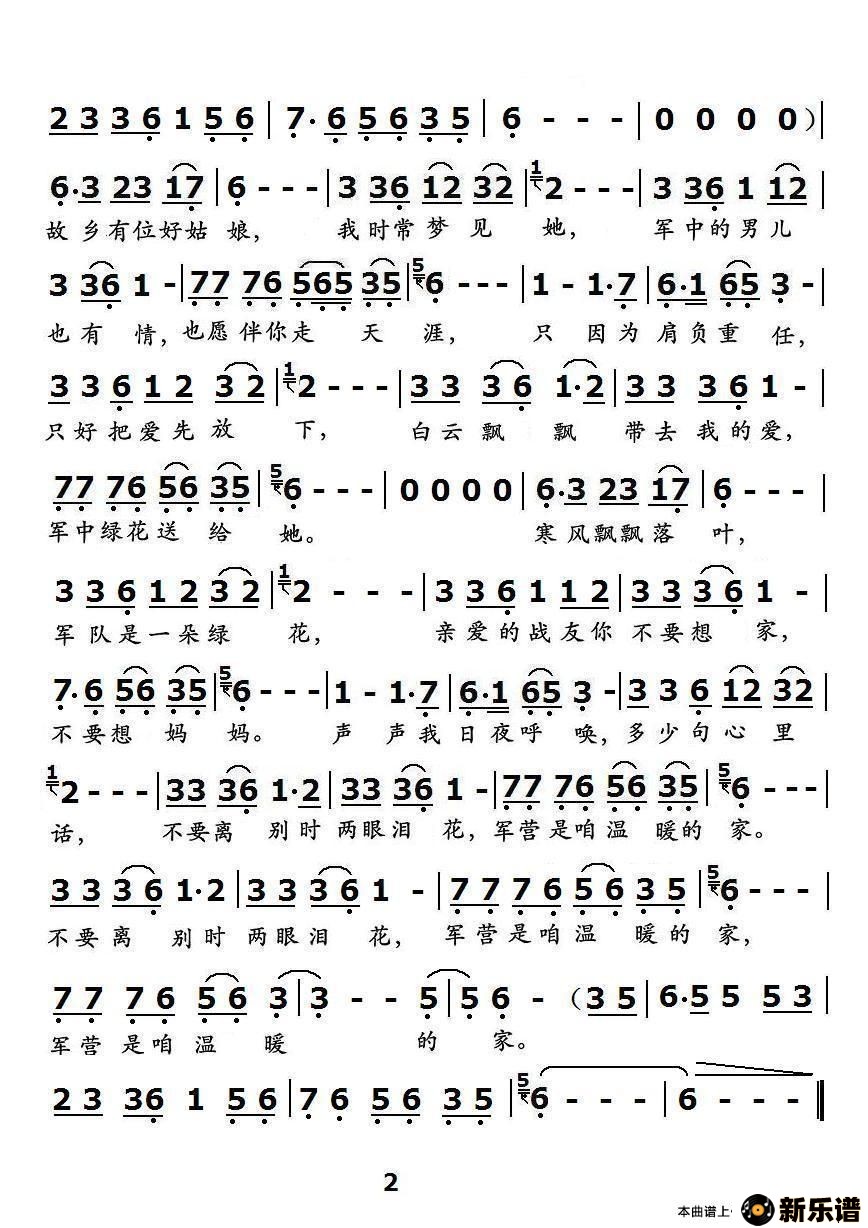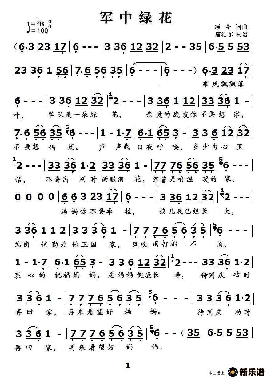 小曾演唱的军中绿花歌词,军中绿花最新曲谱.