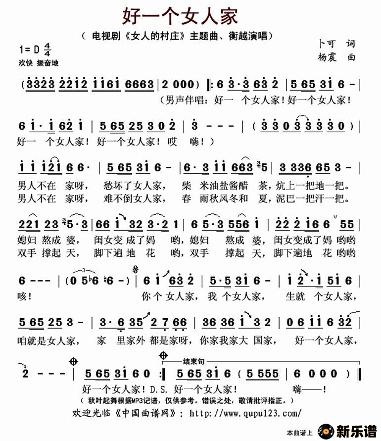 衡越演唱的好一个女人家(电视剧《女人的村庄》主题曲)歌词,好一个女人家(电视剧《女人的村庄》主题曲)最新曲谱.