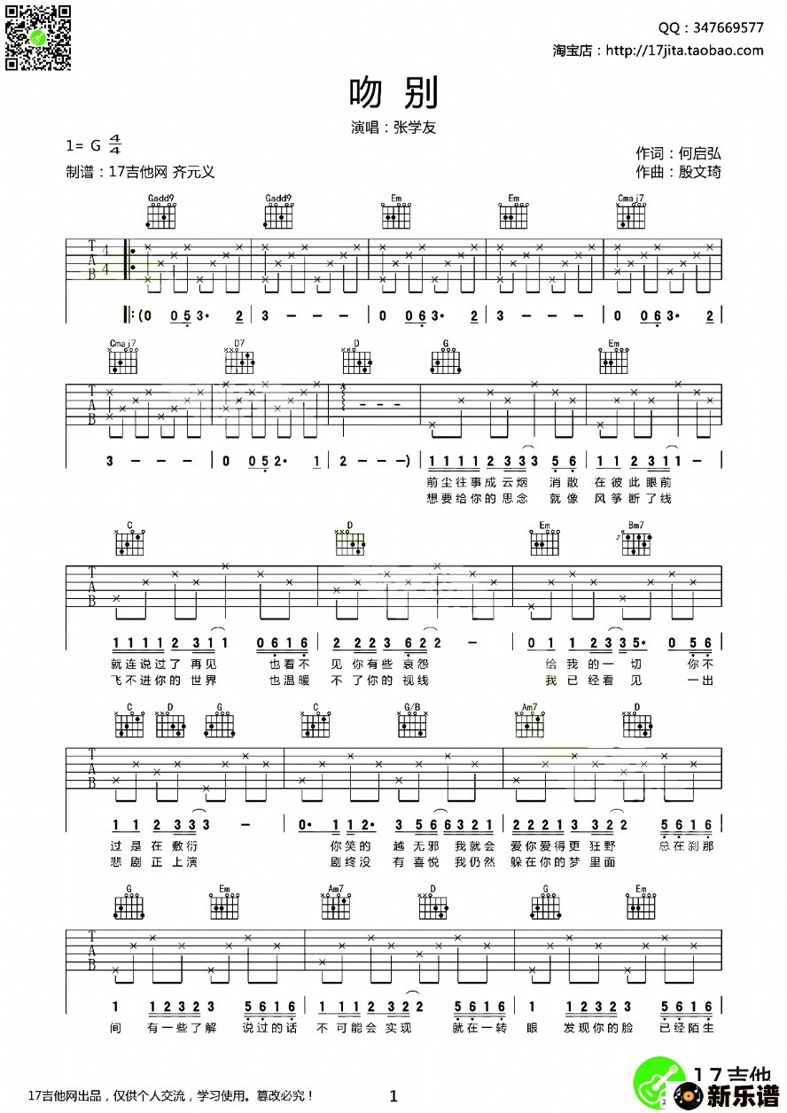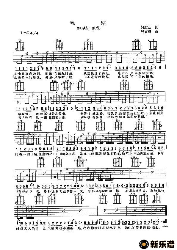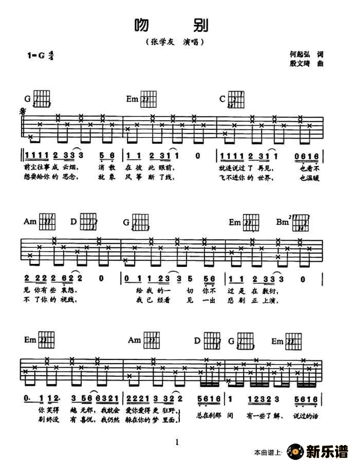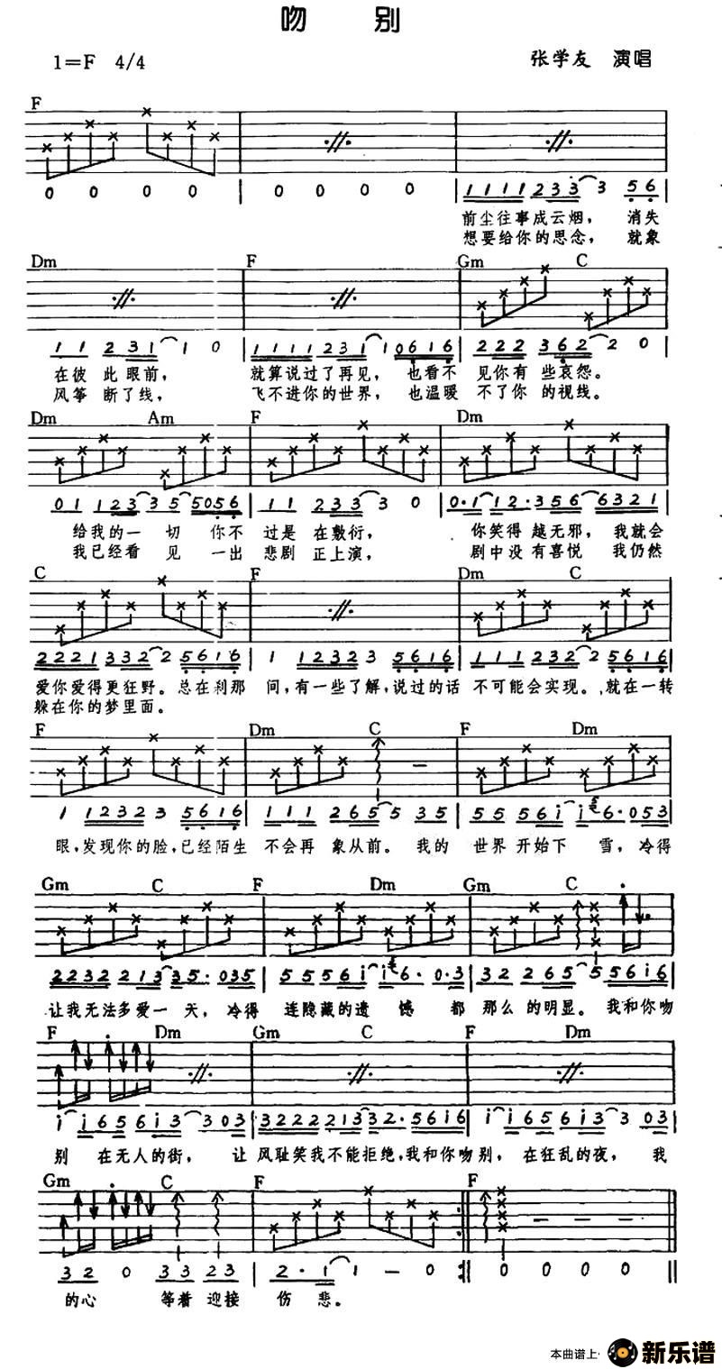 张学友演唱的吻别歌词,吻别最新曲谱.