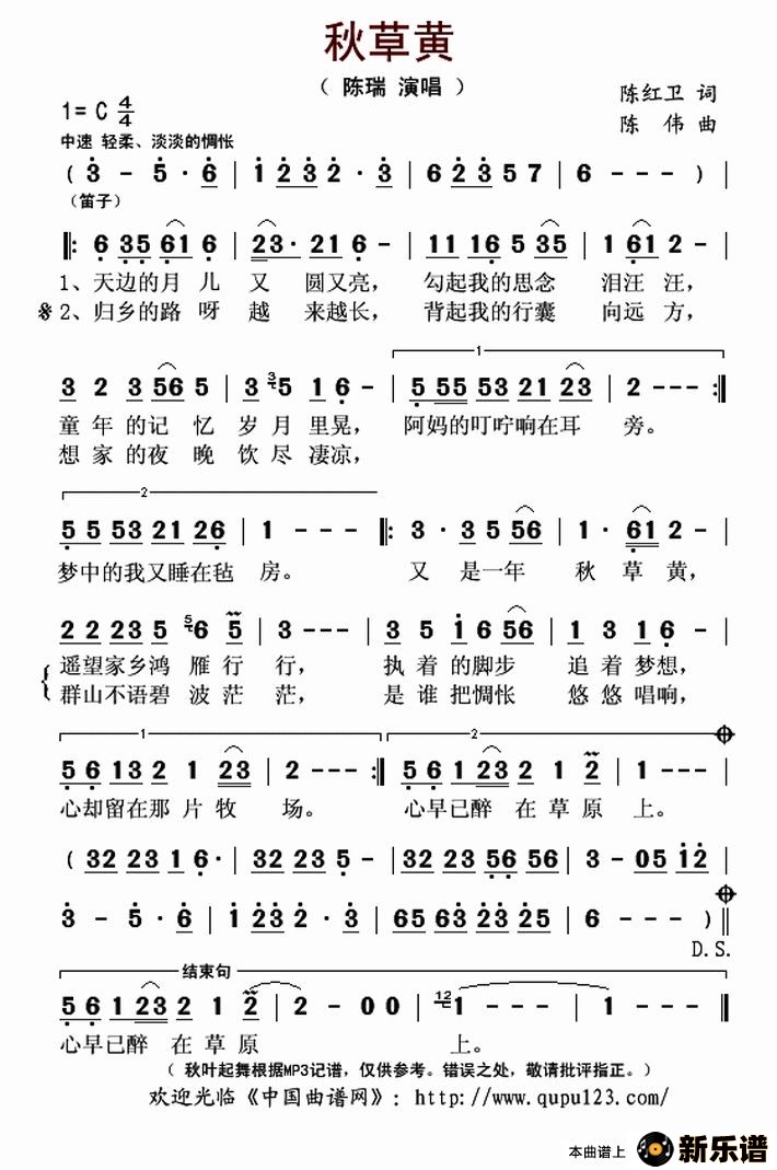 陈瑞演唱的秋草黄歌词,秋草黄最新曲谱.