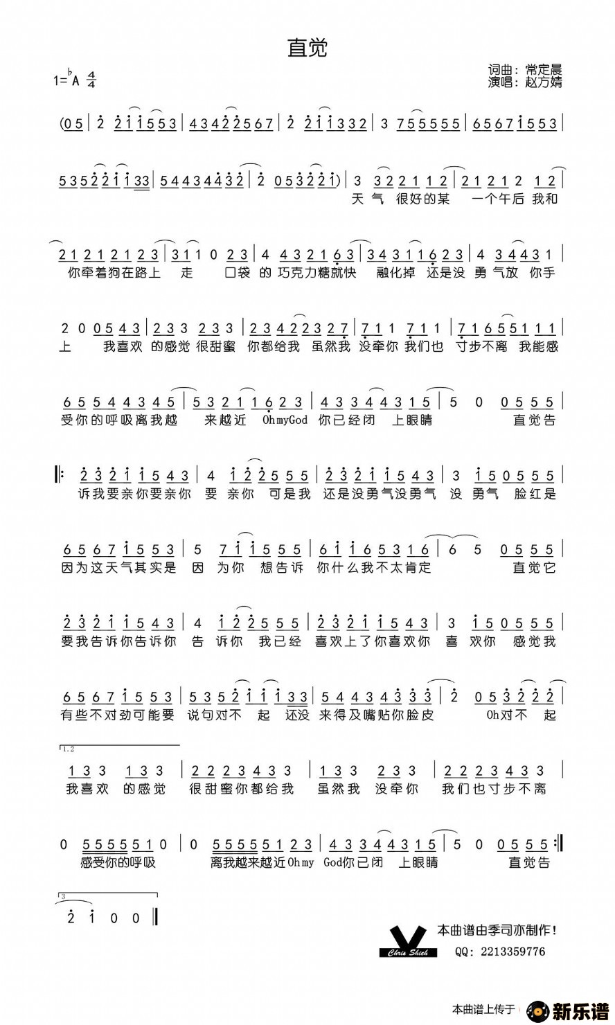 赵方婧演唱的直觉歌词,直觉最新曲谱.