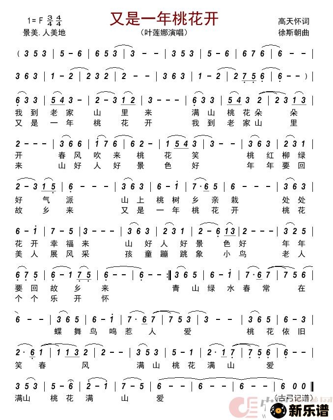 叶莲娜演唱的又是一年桃花开 歌词,又是一年桃花开 最新曲谱.