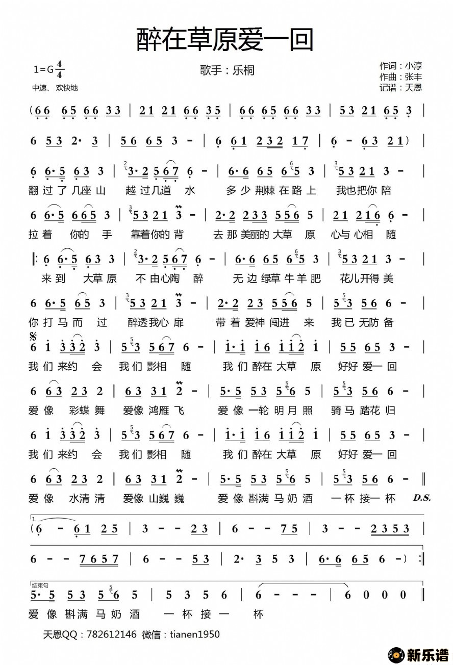 《醉在草原爱一回》最新曲谱 乐桐-天恩制谱