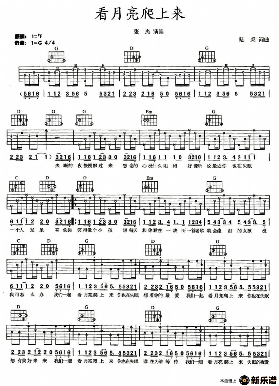 张杰演唱的看月亮爬上来歌词,看月亮爬上来最新曲谱.