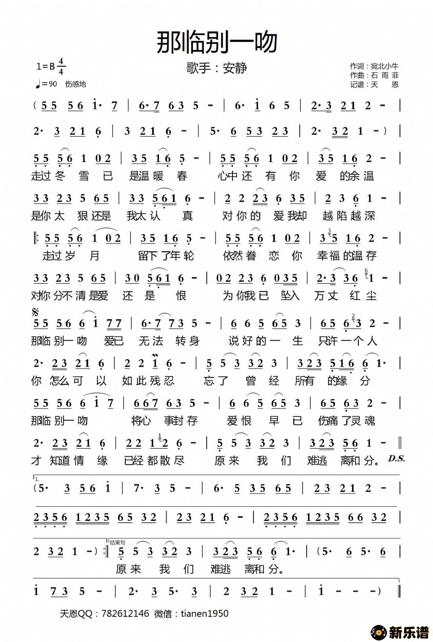 《那临别一吻》最新曲谱 安静-天恩制谱
