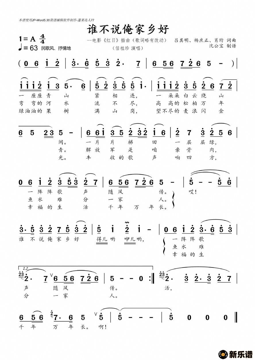 《谁不说俺家乡好》最新曲谱 任桂珍-沈公宝制谱