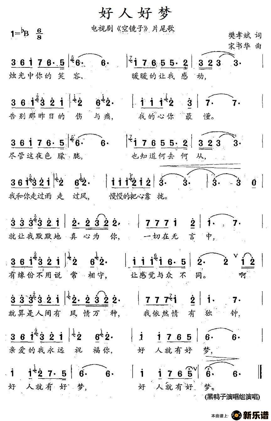 好人好梦(电视剧《空镜子》片尾曲)孙悦、邰正宵 孙悦、邰正宵演唱的好人好梦(电视剧《空镜子》片尾曲)歌词,好人好梦(电视剧《空镜子》片尾曲)最新曲谱. 版本一:转自《彩虹简谱网 》版本二:谱友北京娃娃上传版本三