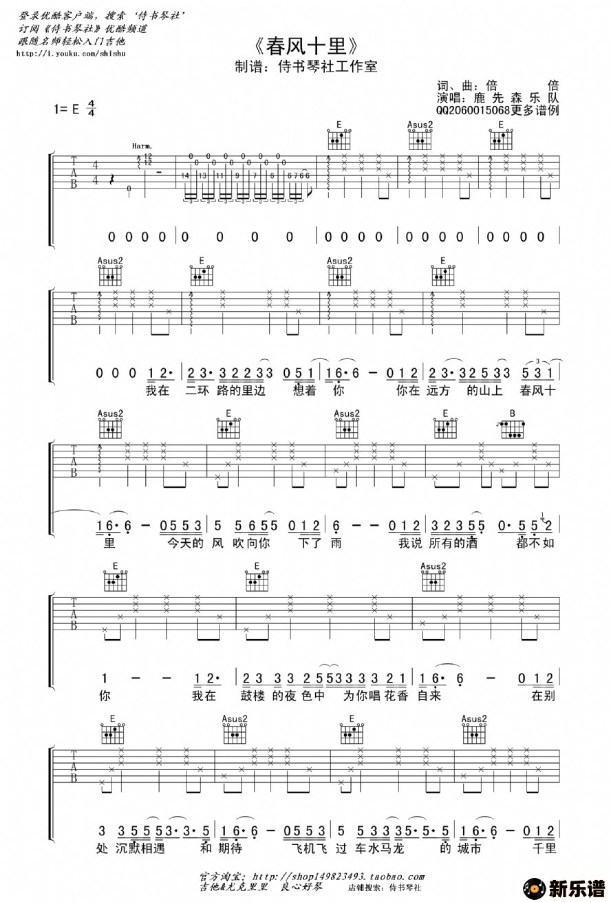 鹿先森乐队《春风十里》吉他谱_吉他弹唱教学_中弦音乐e调版吉他谱