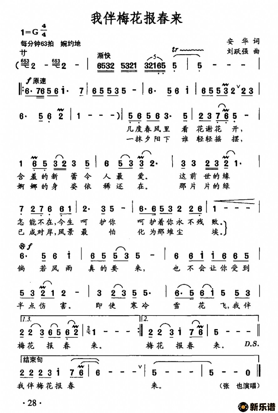 张也演唱的我伴梅花报春来歌词,我伴梅花报春来最新曲谱.