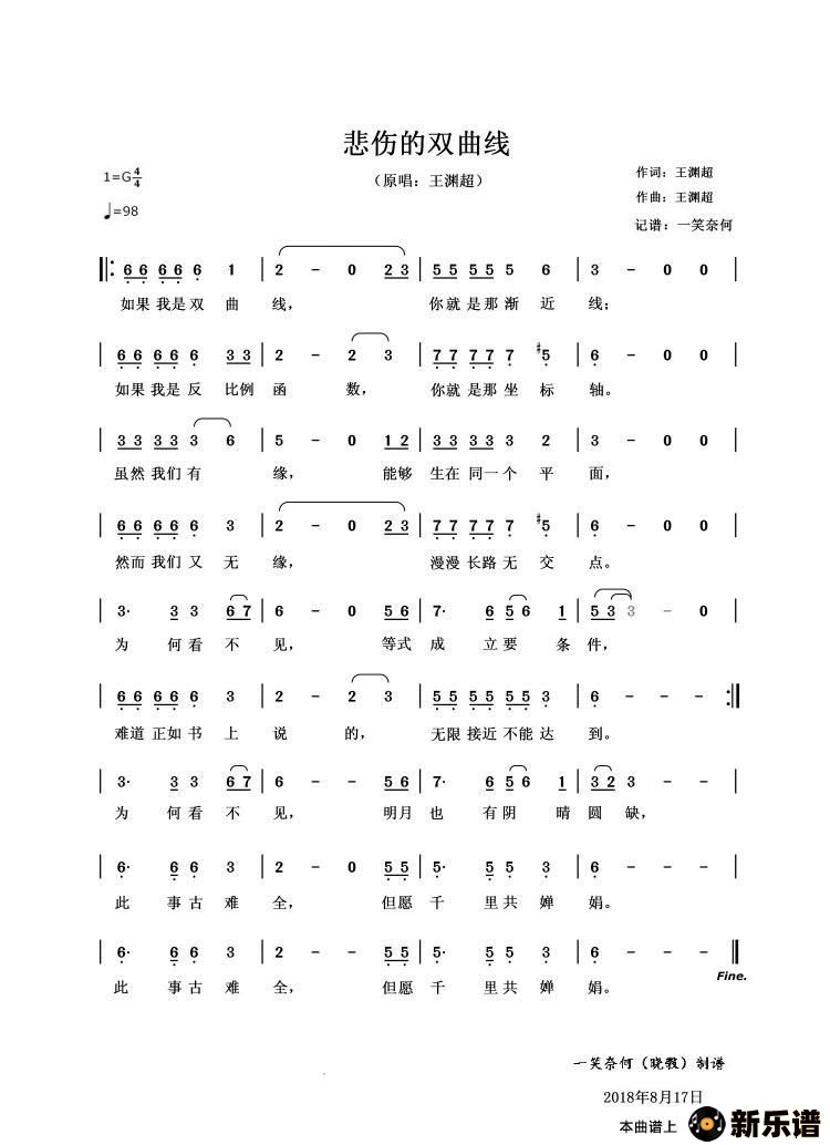 《悲伤的双曲线》最新曲谱 王渊超-一笑奈何晓斅制谱