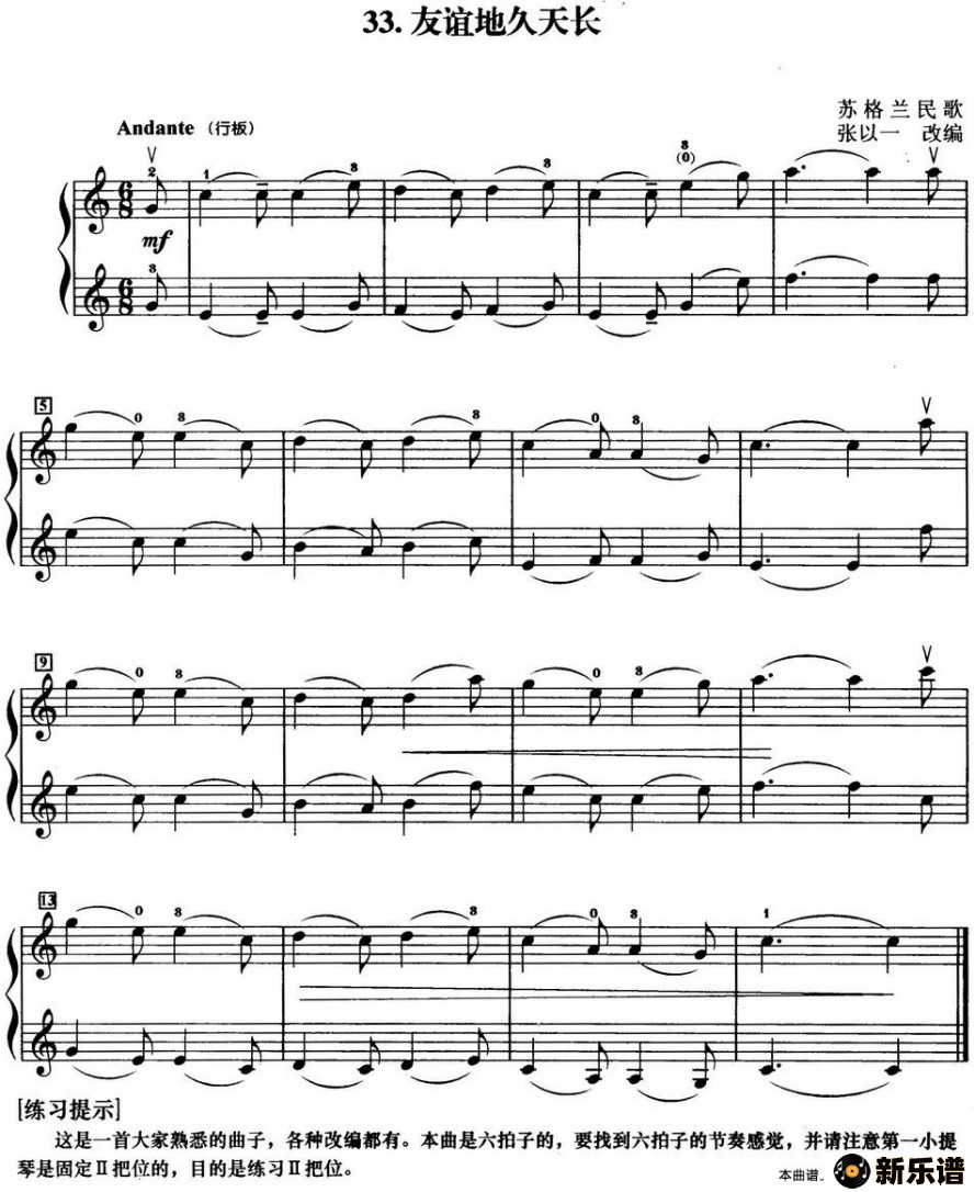 > 初级小提琴二重奏:友谊地久天长最新曲谱