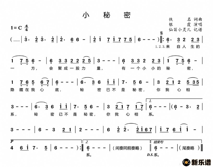 银霞演唱的小秘密歌词,小秘密最新曲谱.