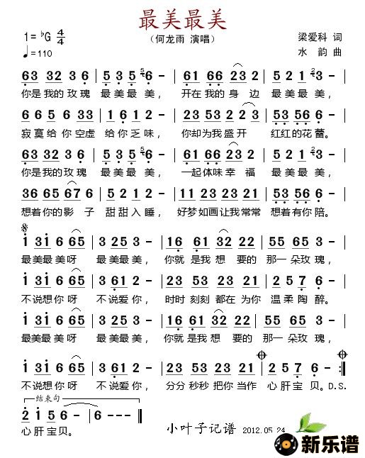 何龙雨演唱的最美最美歌词,最美最美最新曲谱.
