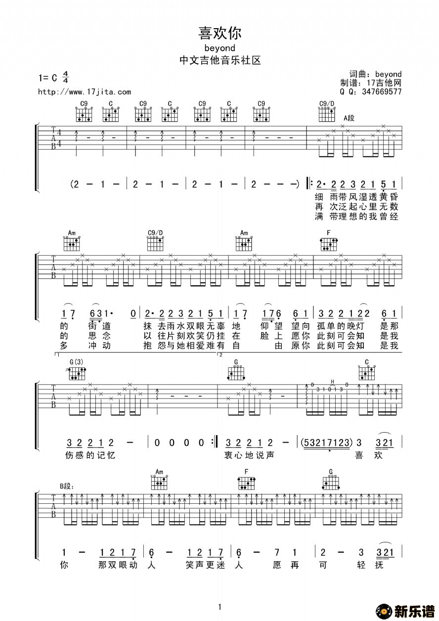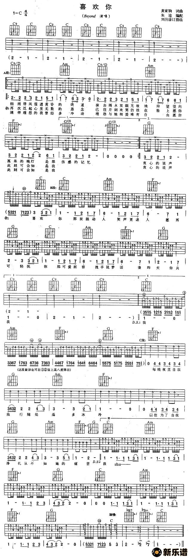 《喜欢你》最新曲谱 Beyond