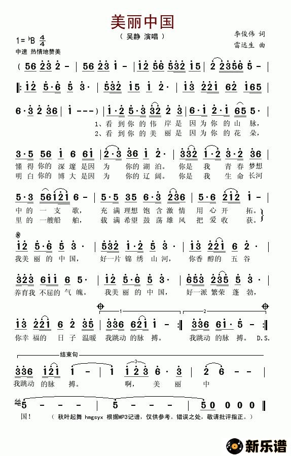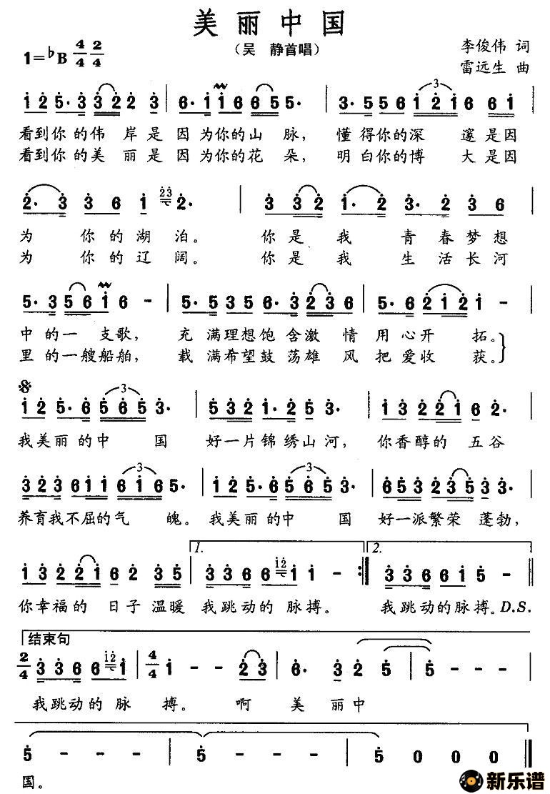 吴静演唱的美丽中国歌词,美丽中国最新曲谱.