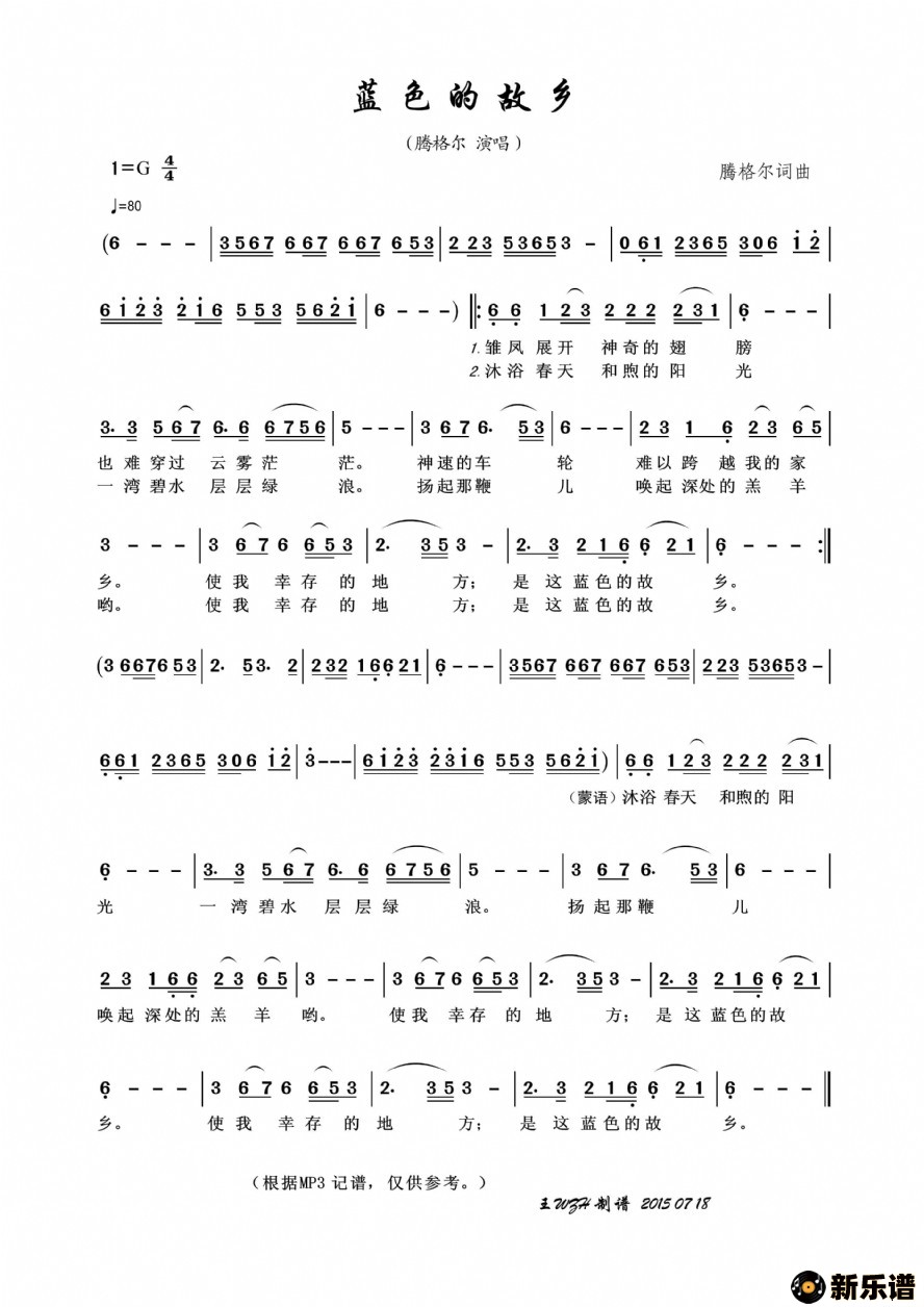 《蓝色的故乡》最新曲谱 腾格尔