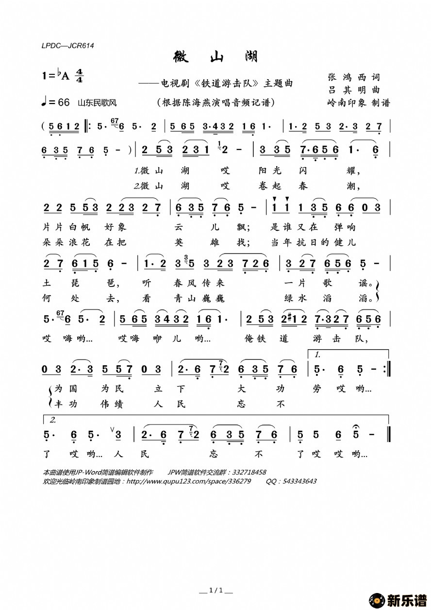 《微山湖(电视剧《铁道游击队》主题曲)》最新曲谱 陈海燕-岭南印象制谱