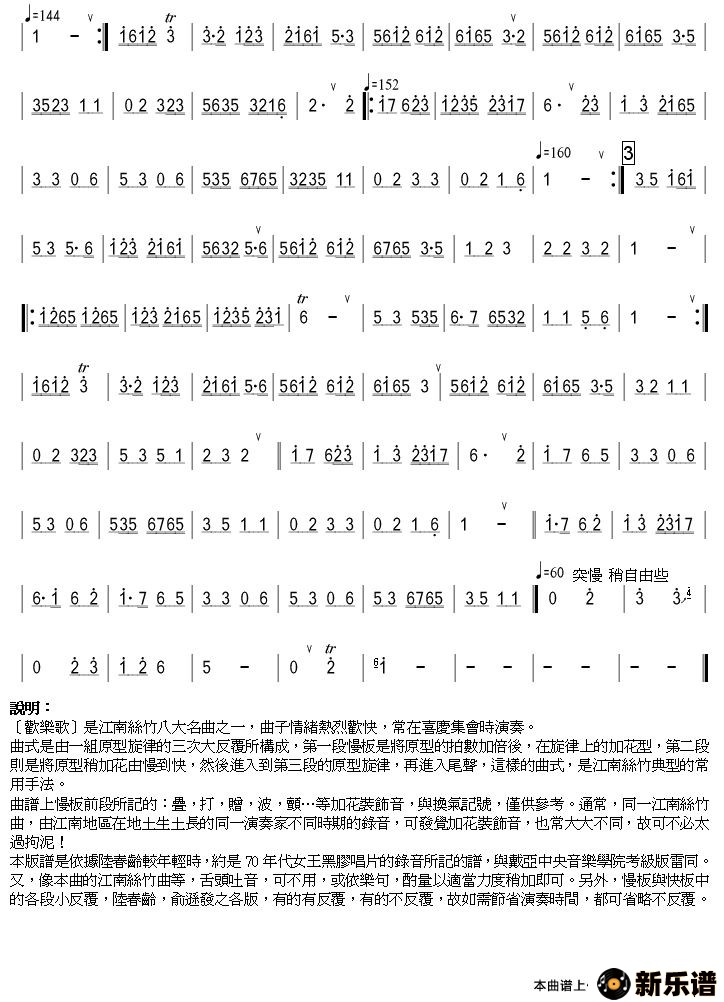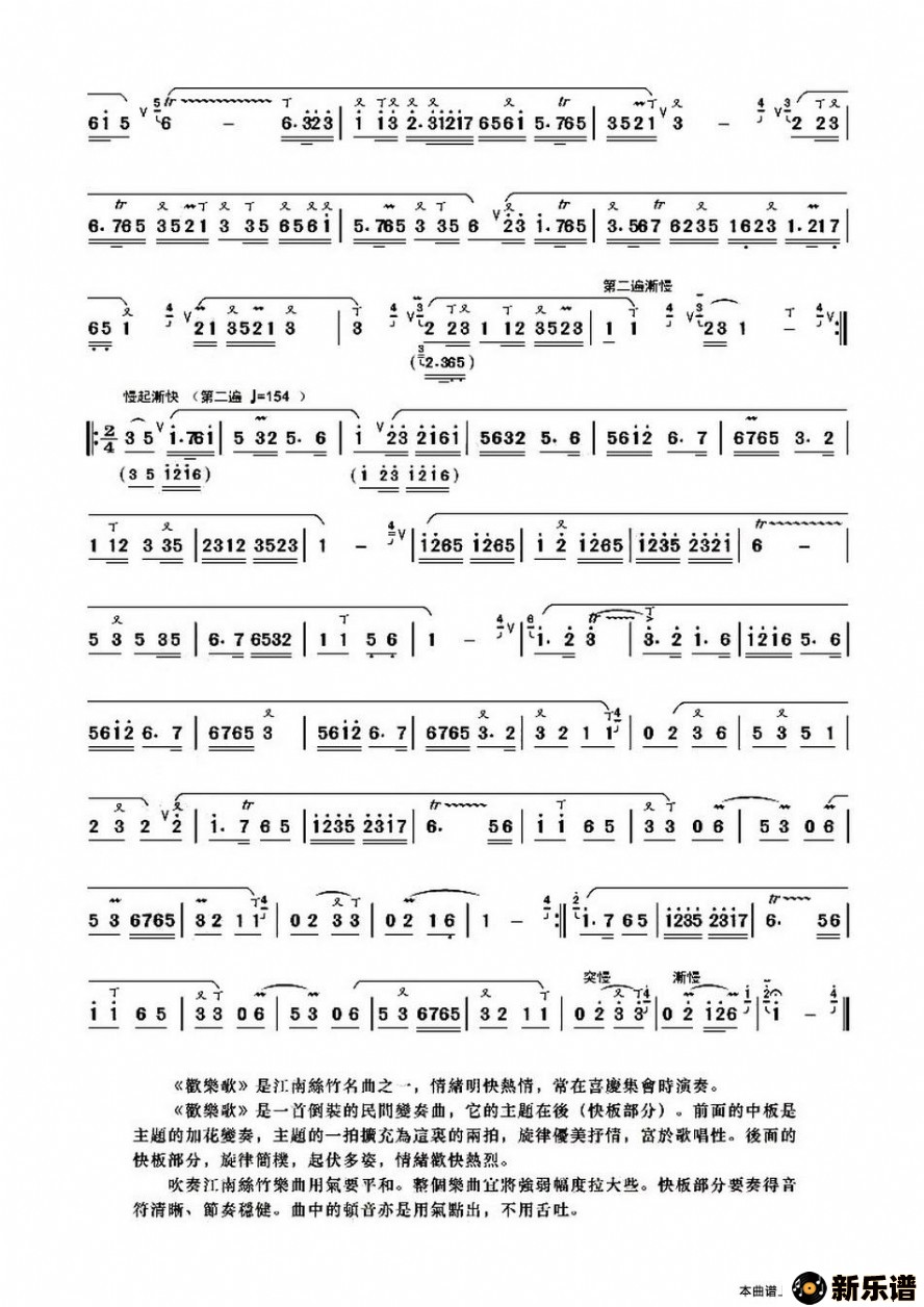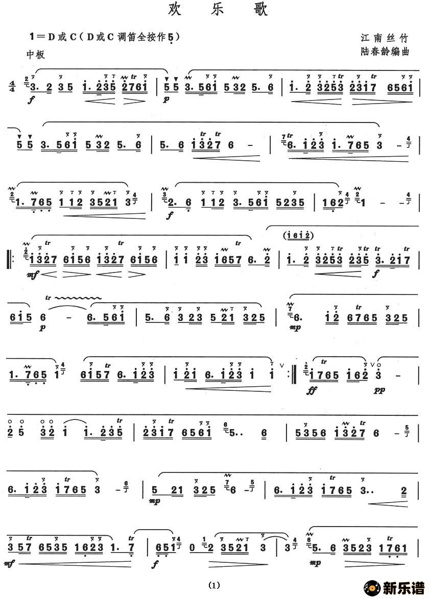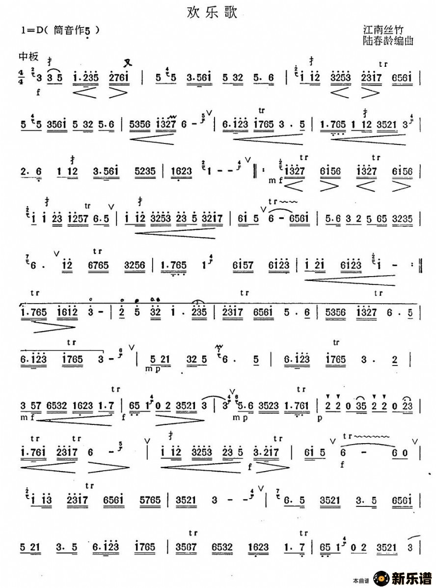 欢乐歌 演唱的欢乐歌歌词,欢乐歌最新曲谱. 版本一:选自蒋国基编著的《笛子入门教材》版本二:转自《乐谱库》版本三:转自《中国竹笛网》版本四:转自《萧雅集》版本五:本站上传版本六:版本一:谱友丝竹常清上传,江苏太仓五洋丝竹乐团演奏谱。