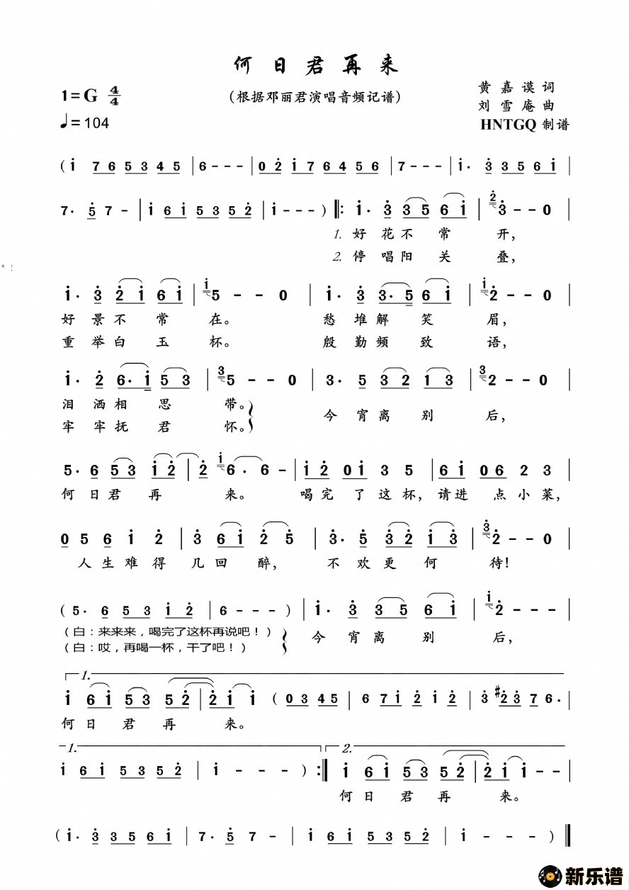 邓丽君演唱的何日君再来歌词,何日君再来最新曲谱.