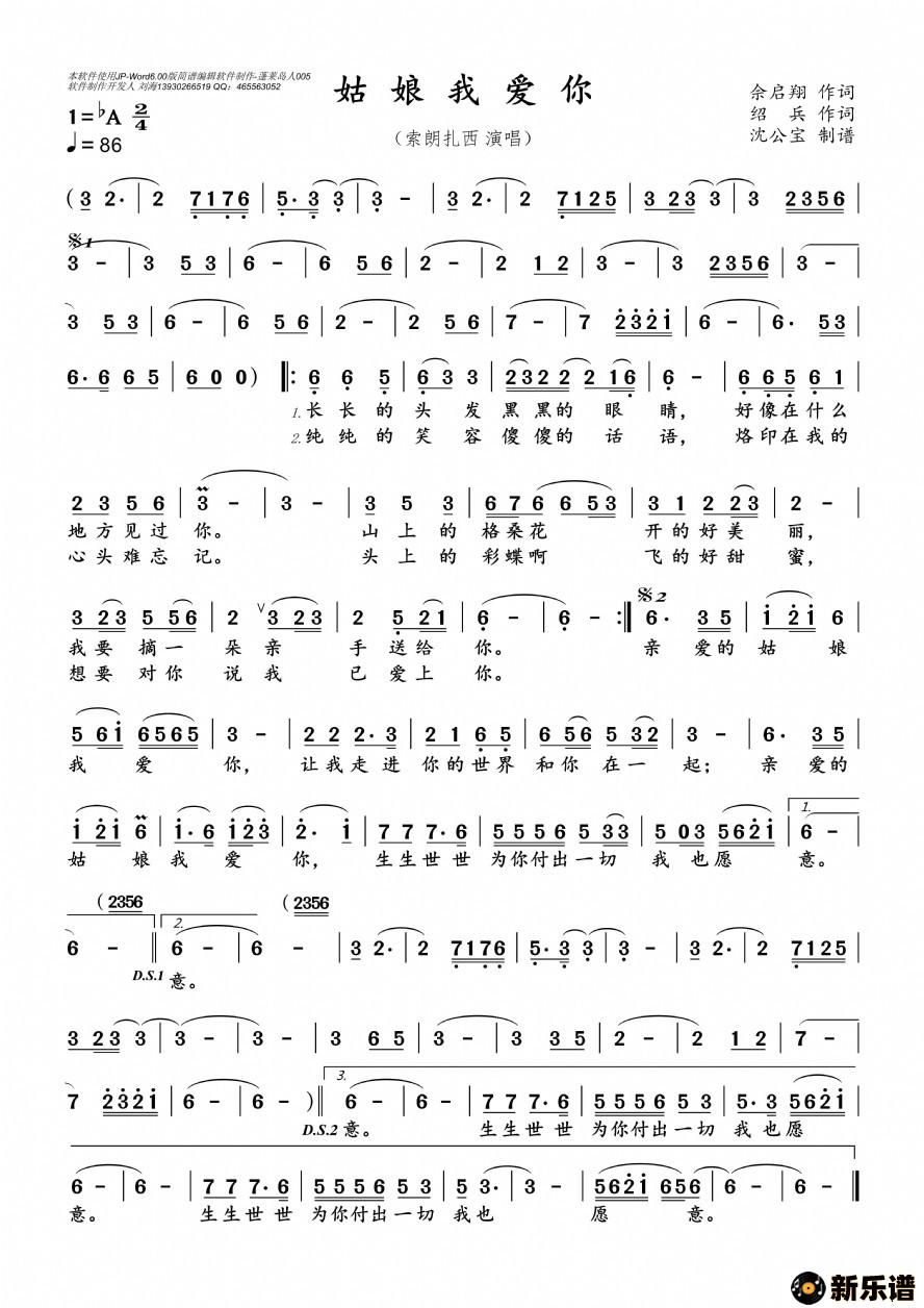 《姑娘我爱你》最新曲谱 索朗扎西-沈公宝制谱