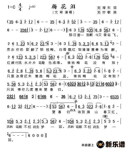 文希演唱的梅花泪歌词,梅花泪最新曲谱.