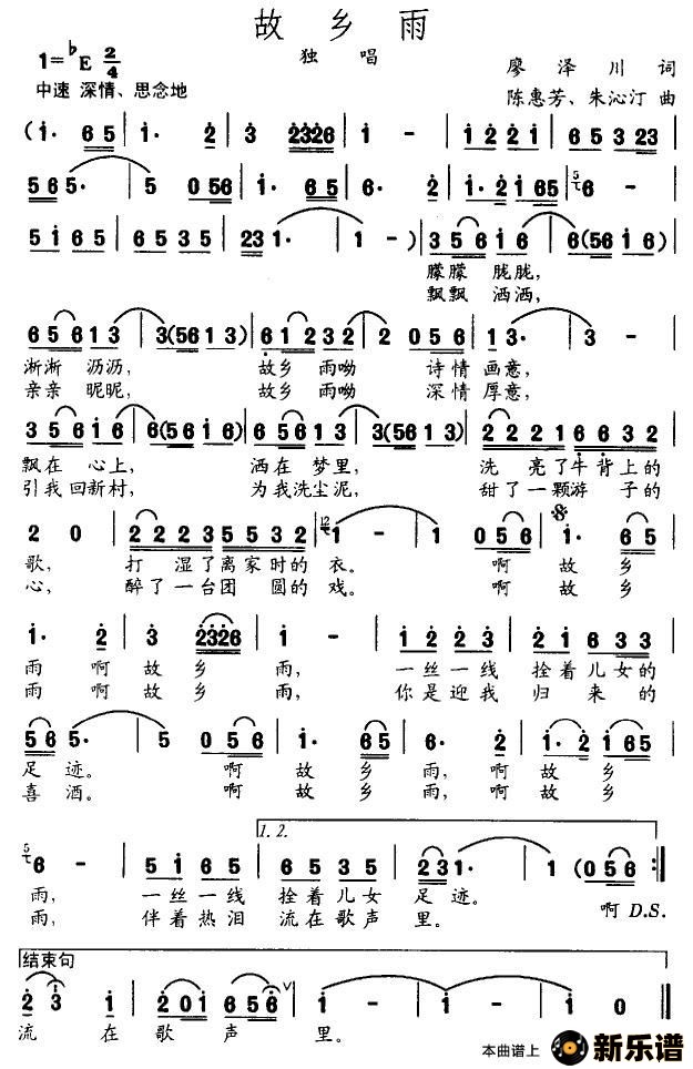 演唱的故乡雨歌词,故乡雨最新曲谱.